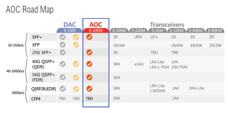 T-TECH offers a wide range of products for 1m to 100m reaches, in CXP, QSFP28, QSFP, SFP28, SFP+ form factors and data rates of 10G~100G.